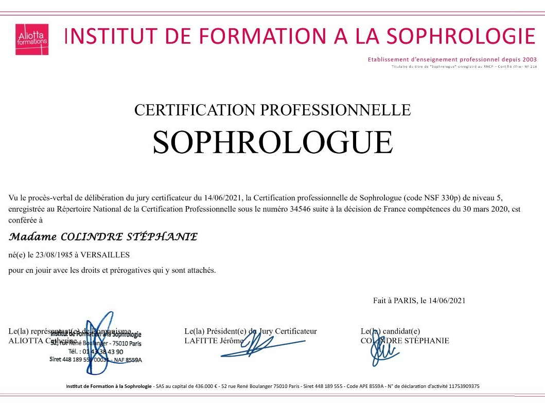 Je suis diplômée de l'Institut de formation à la sophrologie, première école de France habilitée à délivrer une certification professionnelle de sophrologue inscrite au RNCP (Répertoire national des certifications professionnelles).